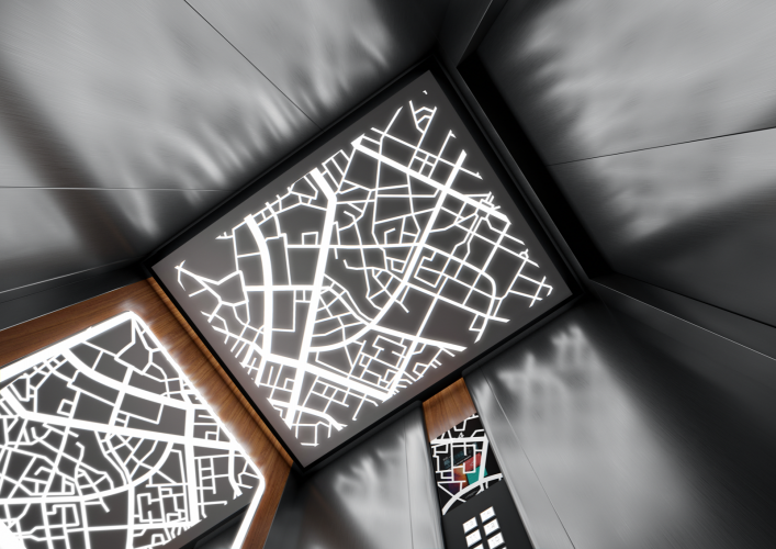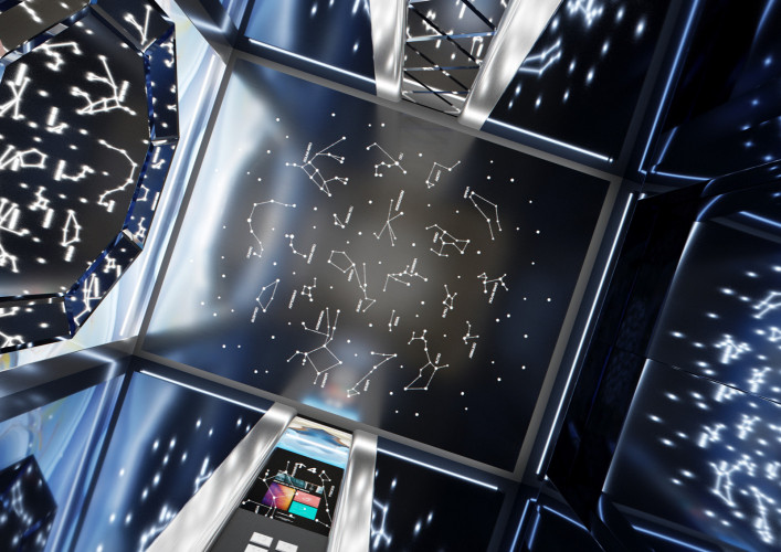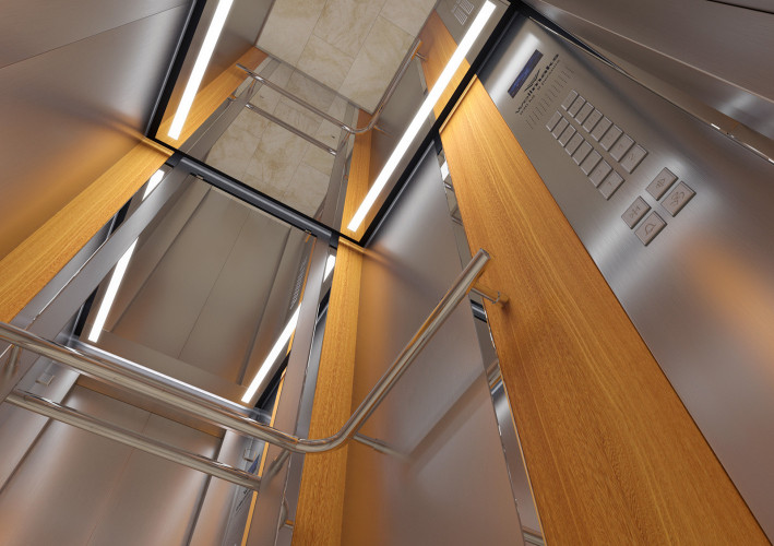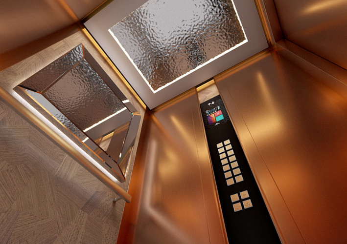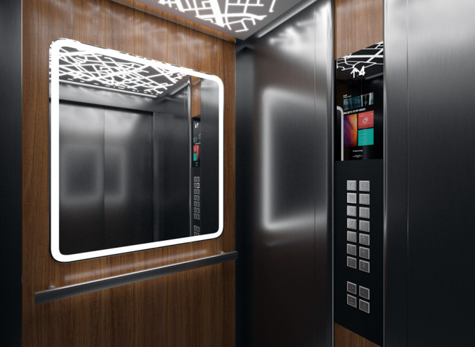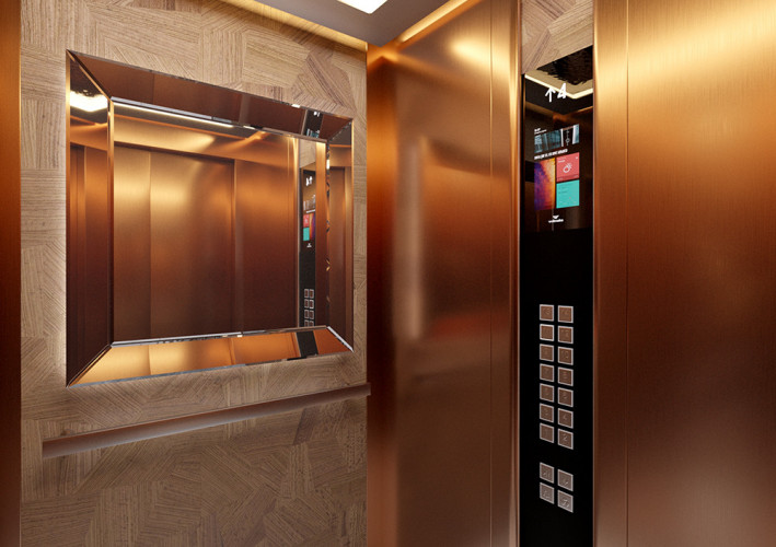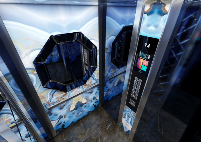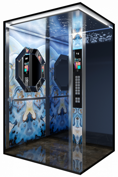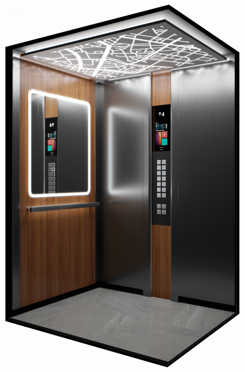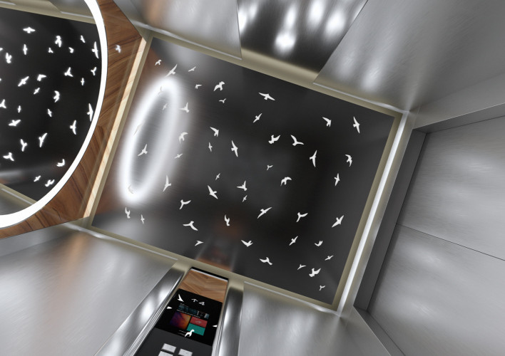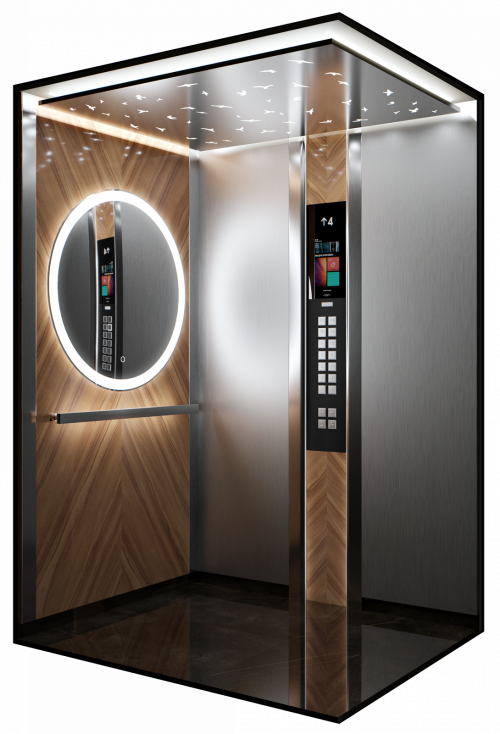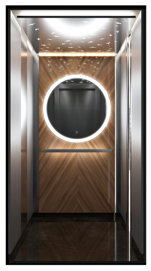 Данная модель сочетает в себе шлифованную и полированную нержавеющую сталь, темный камень и натуральное дерево. Панель из шпона эльдорадо с зеркальным рисунком, располагающуюся на задней стенке кабины, изящно дополняет круглое зеркало Ring с фронтальной и фоновой подсветкой.